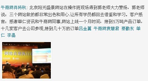 2012年,牛商網(wǎng)是不斷成長的一年,這一年,幫助了老兵茅臺,月子雞,桑樂太陽能,陽光盛景等700多家企業(yè)建立了營銷型網(wǎng)站,平均每月建站60多個,每天都有企業(yè)向牛商網(wǎng)營銷型網(wǎng)站建設(shè)公司報喜,牛商網(wǎng)建設(shè)的營銷型網(wǎng)站給他們企業(yè)領(lǐng)來了一個個訂單!詳情可點擊立即咨詢