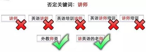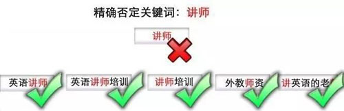否定關(guān)鍵詞(類似于短語匹配)——當(dāng)且僅當(dāng)網(wǎng)名的搜索詞中完全包含否定關(guān)鍵詞時(shí),推廣結(jié)果將不會(huì)展現(xiàn)。舉個(gè)栗子,當(dāng)你設(shè)置“講師”為否定關(guān)鍵詞時(shí),打√就表示會(huì)顯示廣告,打×就不會(huì)顯示廣告: