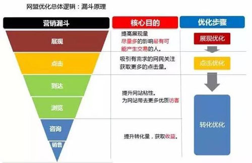 有了前三步作為鋪墊,一個(gè)相對(duì)完善的網(wǎng)盟賬戶已經(jīng)建立了,接下來(lái)我們要做的就是優(yōu)化,并且持續(xù)優(yōu)化。網(wǎng)盟的優(yōu)化要遵循其本身的邏輯--漏斗原理: