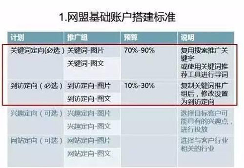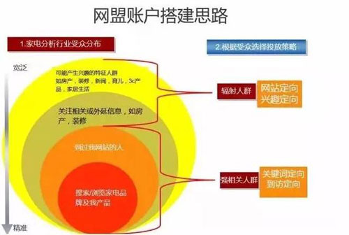 競(jìng)價(jià)賬戶的結(jié)構(gòu)與網(wǎng)盟賬戶結(jié)構(gòu)是相似的,一個(gè)網(wǎng)盟賬戶計(jì)劃同樣至少創(chuàng)建2個(gè)推廣組。然而單一使用地域定向、興趣定向、網(wǎng)站定向這3種方式所達(dá)到的推廣效果是相當(dāng)有限的,所以我們需要合理組合定向方式: