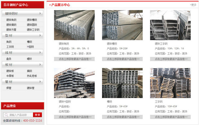 產(chǎn)品中心:根據(jù)牛商網(wǎng)網(wǎng)絡(luò)營(yíng)銷專家調(diào)研,和百豐鋼材貿(mào)易商量,把產(chǎn)品進(jìn)行了多種分類,每種產(chǎn)品詳細(xì)的列舉出來在首頁展示,讓訪客第一眼就能看到有沒有自己需要的產(chǎn)品