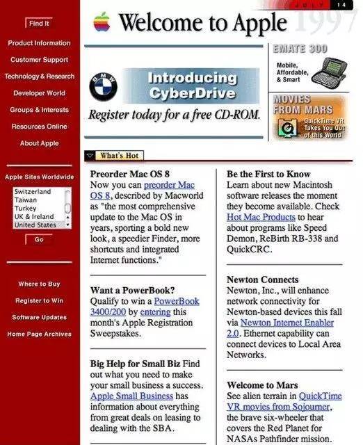 下圖是1996年的蘋果網站,如果蘋果網站是人,這絕對是她最想毀掉的照片!哈哈哈!
