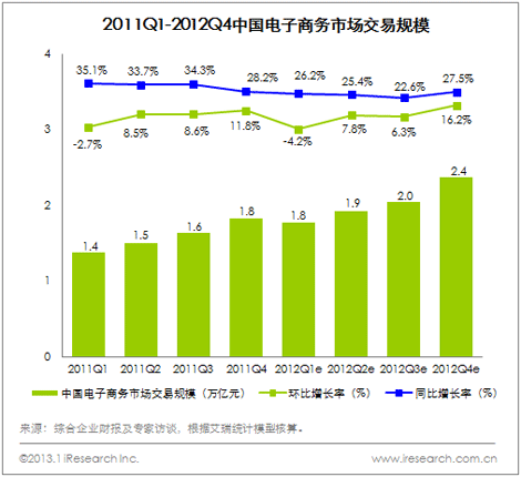 2012Q4電子商務(wù)市場(chǎng)整體交易規(guī)模2.4萬(wàn)億元,環(huán)比增長(zhǎng)16.2%,同比增長(zhǎng)27.5%