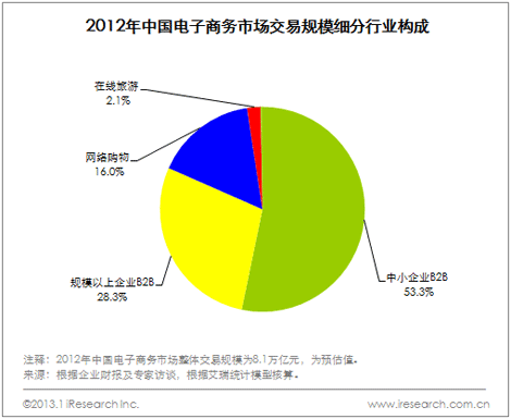2012年電子商務(wù)交易規(guī)模市場(chǎng)格局中,B2B合計(jì)占比81.6%,網(wǎng)購(gòu)占比16.0%,有較大提升