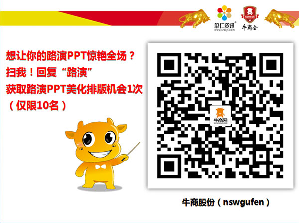 演講已經(jīng)成為一種社會化營銷,企業(yè)家通過演說來展示獨(dú)特的人格魅力,或?qū)媸聵I(yè)的關(guān)心,或?qū)ι鐣?zé)任的擔(dān)當(dāng),從而完成對企業(yè)和產(chǎn)品的有力宣傳,企業(yè)家自己就是企業(yè)和產(chǎn)品的最好的形象代言人。第七屆中國電子商務(wù)十大牛商評選線下路演想要出彩高票勝出,除了好的演講能力還需要好的PPT助攻。你的ppt能夠打動評委和現(xiàn)場觀眾甚至“驚艷全場”嗎?如果你正為此苦惱,牛商網(wǎng)可以幫到你。牛商網(wǎng)專業(yè)團(tuán)隊將免費(fèi)為企業(yè)美化路演ppt,名額有限僅開放10名。一定要眼快手快!怎么獲得呢?關(guān)注牛商網(wǎng)官方微信(微信號nswgufen),回復(fù)關(guān)鍵詞“路演”,點(diǎn)擊“你砸金蛋,我?guī)湍忝阑费輕pt”,即可抽取“路演ppt美化機(jī)會1次”。牛商網(wǎng)官方微信二維碼和抽獎操作詳情請看下面圖片。