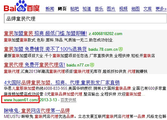 品牌童裝加盟這個(gè)關(guān)鍵詞在百度搜索都是排在第一位置。