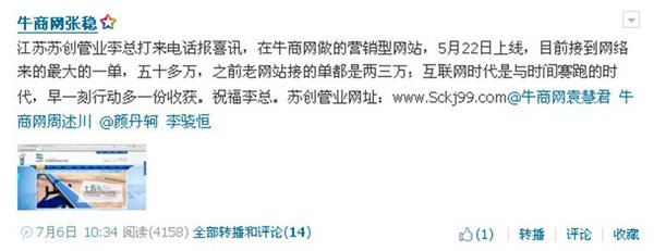 3、在上線后公司并沒重視,但基于營(yíng)銷型網(wǎng)站是完全為蘇創(chuàng)管業(yè)定制的,優(yōu)化好,而且頁面非常符合潛在客戶的需求,所以7月6號(hào)牛商網(wǎng)無錫的張總便接到李總的喜報(bào)——接到50萬訂單,自此李總便對(duì)網(wǎng)站重視起來!