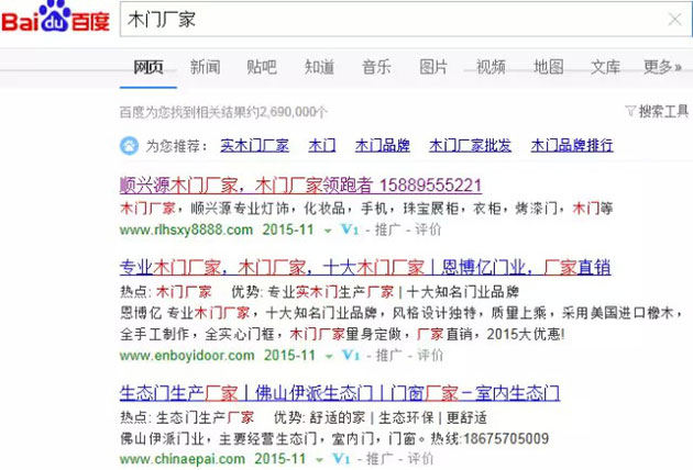 很多企業(yè)家開通百度競價時為了“省錢”,使用百度免費贈送的網(wǎng)站、或者是貪便宜做的模板網(wǎng)站,甚至還有鏈接阿里、淘寶店鋪的。殊不知這樣的“免費”其實是在燒錢,有圖為證!有個企業(yè)做項目急需木門供應(yīng)商,于是在百度輸入“木門廠家”,出來的結(jié)果如【圖1】: