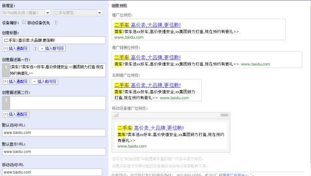 通順主要分為2個優(yōu)化方面:①描述語句時的通順。我想這一點大家都可以做到,非常簡單,寫好之后自己讀一讀。②賬戶結構對通順的影響。由于通配符具有替換關鍵詞的作用,如果我們沒有對不同詞性的關鍵詞進行分類的話,無論我們寫得再好,最后網民看到的創(chuàng)意都可能是不通順的。