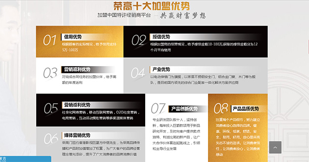 榮高門業(yè)營銷型網(wǎng)站項目啟動初期,牛商網(wǎng)便協(xié)助榮高門業(yè)重新定位為招商加盟。在網(wǎng)站策劃階段就從客戶角度出發(fā),首頁把客戶關(guān)心的招商政策講透,告訴客戶市場前景、加盟的好處、榮高給予的十大支持等。選擇黑白黃三主色設(shè)計簡潔,按照營銷原則排版內(nèi)容,清晰明了,客戶獲取信息快,詢盤率遠(yuǎn)遠(yuǎn)高于同行。 為了不讓網(wǎng)絡(luò)營銷落后于人,榮高前期資料準(zhǔn)備充足、加上和牛商網(wǎng)的高效溝通,榮高門窗招商加盟營銷型網(wǎng)站只用了40天就上線了。并且,在網(wǎng)站上線同時,網(wǎng)銷團隊也已經(jīng)組建到位。新網(wǎng)站上線3天就被百度收錄多個頁面,1周就接到了多個有效詢盤。 |