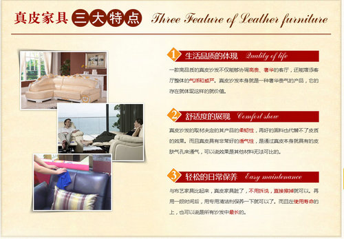 做完公司優(yōu)勢的展示還不夠,這里還把真皮家具的三大特點完美的展示出來,告示訪客,一款高品質(zhì)的真皮沙發(fā)不僅能夠協(xié)調(diào)高貴、奢華的客廳,還能增添客廳整體的氣派和威嚴。真皮沙發(fā)本身就是一種奢華貴氣的產(chǎn)品,它的存在就體現(xiàn)這樣的就價值。與布藝家具比起來,真皮家具臟了,不用拆洗,直接擦掉就可以。再用一段時間后,用專用清潔劑保養(yǎng)一下就可以了。而且在使用壽命的上,也可以說是所有沙發(fā)中最長的。一系列的有點說明了真皮家具的優(yōu)勢!