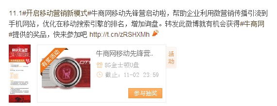 11.1#開啟移動(dòng)營(yíng)銷新模式#牛商網(wǎng)移動(dòng)先鋒營(yíng)啟動(dòng)啦,幫助企業(yè)利用微營(yíng)銷傳播引流到手機(jī)網(wǎng)站,優(yōu)化在移動(dòng)搜索引擎的排名,增加詢盤。轉(zhuǎn)發(fā)此微博就有機(jī)會(huì)獲得#牛商網(wǎng)#提供的獎(jiǎng)品,快來參加吧