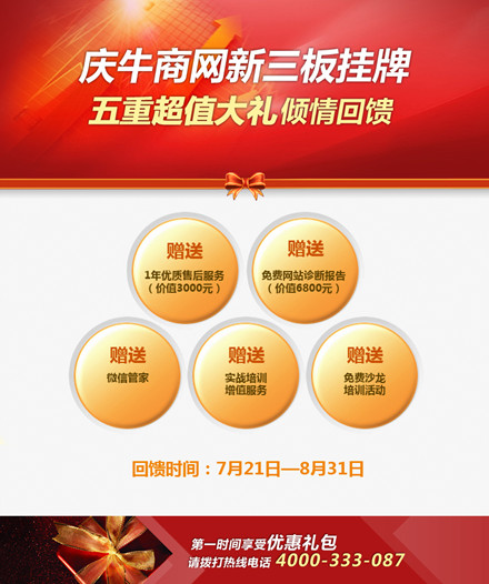 7月18日上午,牛商網(wǎng)在北京舉行隆重的新三板掛牌敲鐘儀式,成為新三板掛牌的中國營銷型網(wǎng)站建設(shè)第一股,股票簡稱:牛商股份,股票代碼:830770。為感謝廣大客戶對牛商網(wǎng)發(fā)展的關(guān)心支持,牛商網(wǎng)上市期間連環(huán)放送五重超值大禮回饋客戶,助您網(wǎng)上盈利。