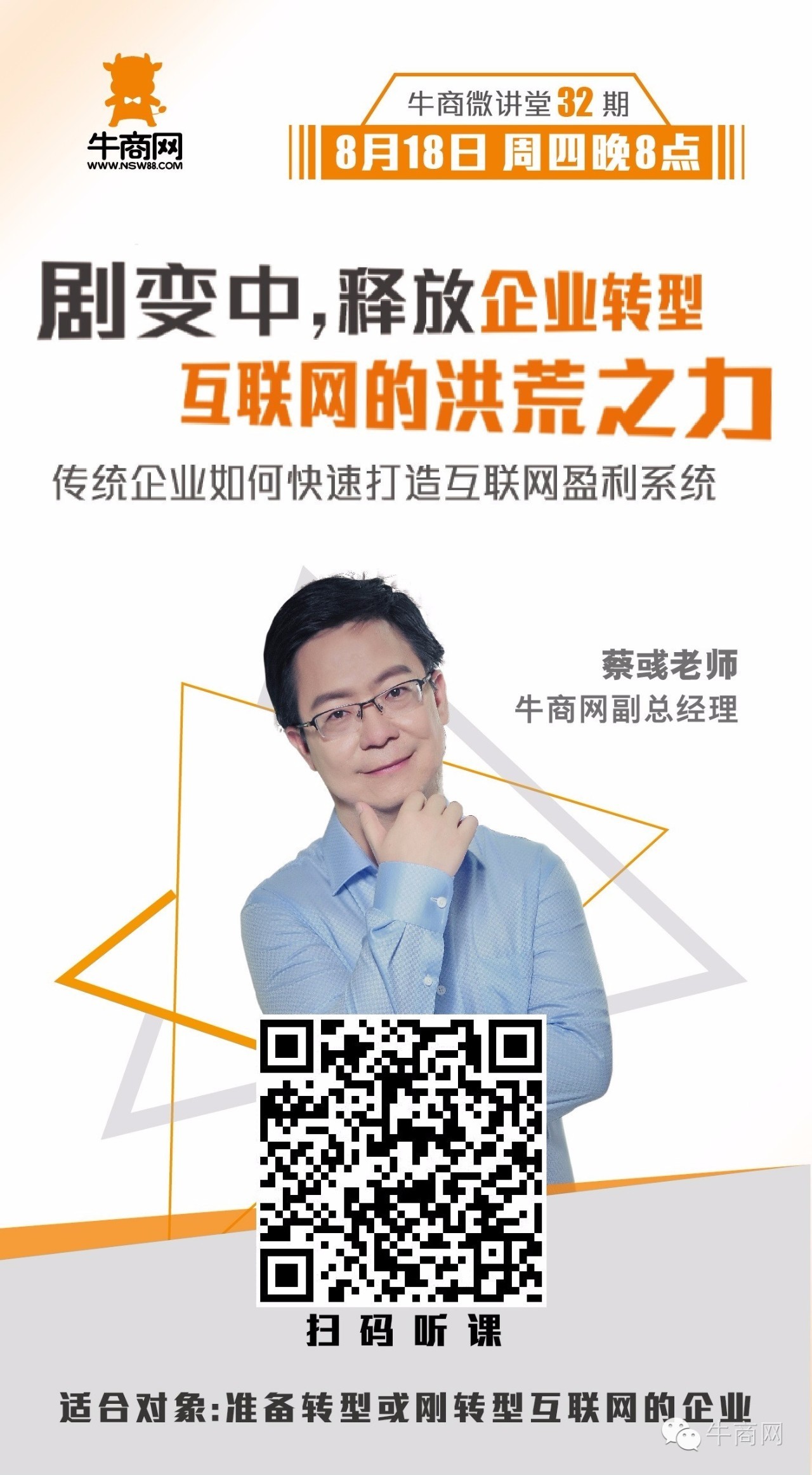 本周四晚8點(diǎn),牛商微講堂特邀網(wǎng)絡(luò)營(yíng)銷(xiāo)專家蔡彧老師,為傳統(tǒng)中小企業(yè)主快速打造互聯(lián)網(wǎng)盈利系統(tǒng)!掃描下方二維碼,報(bào)名即可召喚網(wǎng)絡(luò)營(yíng)銷(xiāo)“八方神器”,釋放企業(yè)轉(zhuǎn)型的洪荒之力!