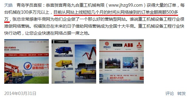 我們計劃今年通過牛商網(wǎng)做的營銷型網(wǎng)站,業(yè)績推到三至五番,達(dá)到六千到七千萬,逐漸從國內(nèi)推廣到世界各地。