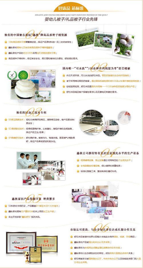 鑫秋家紡營銷型網(wǎng)站以產(chǎn)品展示為主,主要為:嬰兒被,嬰兒被廠家,嬰兒棉被加盟,嬰兒被品牌代理,嬰兒包被