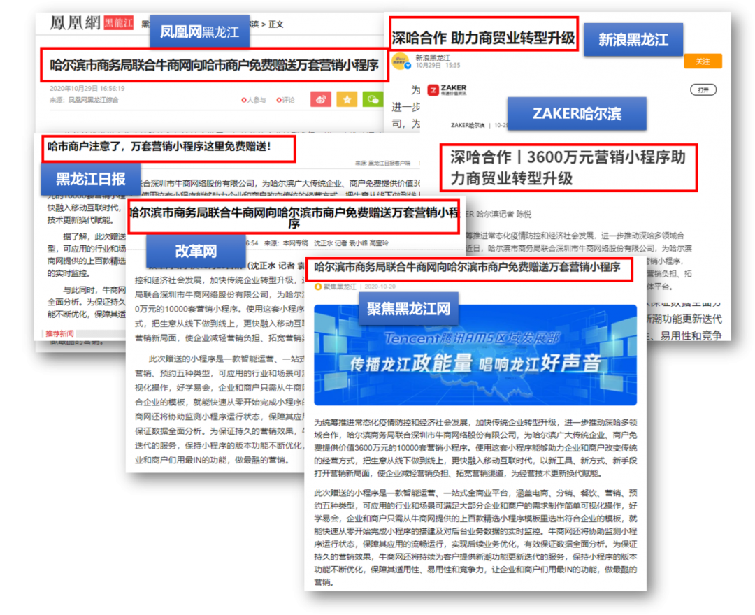 此次牛商網(wǎng)贈(zèng)送的價(jià)值3600萬(wàn)元的10000套營(yíng)銷小程序,受到哈爾濱眾多企業(yè)的歡迎與認(rèn)可, 地方官方媒體也紛紛報(bào)道這一喜訊,對(duì)此提出肯定。