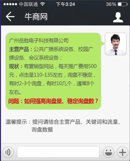 為了幫助更多新老客戶在網(wǎng)上賺到錢,同時助力參加“第七屆中國電子商務(wù)十大牛商評選”活動的牛商更快更好的提升業(yè)績,本期“牛商熱線”直奔主題--提升客戶詢盤的關(guān)鍵。我們的目的是:提升詢盤,快速成交!