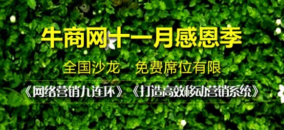 針對以上問題,牛商網(wǎng)定期在全國各地免費舉辦沙龍課程活動,解答各中小企業(yè)網(wǎng)絡(luò)營銷難題,為您企業(yè)提供一整套網(wǎng)絡(luò)營銷解決方案,讓各中小企業(yè)少走彎路,快速走上網(wǎng)絡(luò)營銷軌道!