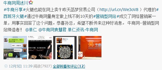 火腿也能在網(wǎng)上賣?2013年12月4日菡夢貿(mào)易公司(www.qqham.com/)代理的西班牙火腿通過牛商網(wǎng)量身定做上線不到10天的營銷型網(wǎng)站成交了網(wǎng)絡(luò)營銷第一單,用事實回答了這個問題。恭喜孫總,希望不斷傳來這種好消息。牛商網(wǎng)--營銷型網(wǎng)站締造者!