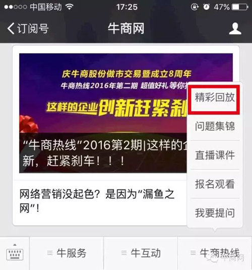 關(guān)注牛商網(wǎng)官方微信nsw88com,點(diǎn)擊菜單欄[牛商熱線]上的[精彩回放]可觀看往期回放和本期課程回放!或者回復(fù)“直播”也能觀看哦!