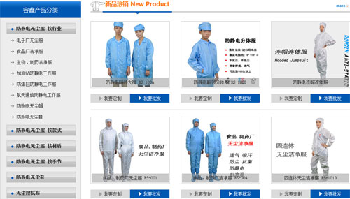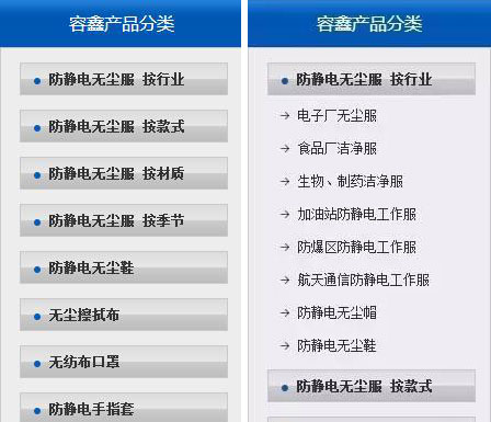 容鑫產(chǎn)品種類多且雜,所以在容鑫的營銷型網(wǎng)站的產(chǎn)品分類里,核心產(chǎn)品“防靜電無塵服”,特意按照“行業(yè)、款式、材質(zhì)、季節(jié)”進行分類,讓意向客戶快速找到自己想要的產(chǎn)品。另外,每個分類可展開折疊的“小心機”設(shè)計,讓網(wǎng)站看起來沒那么雜亂: