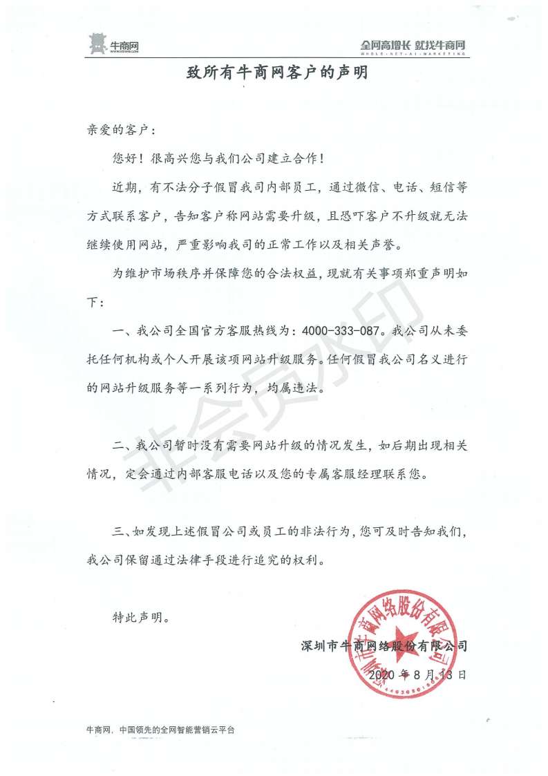 一、我公司全國官方客服熱線為:4000-333-087。我公司從未委托任何機構(gòu)或個人開展該項網(wǎng)站升級服務(wù)。任何假冒我公司名義進行的網(wǎng)站升級服務(wù)等一系列行為,均屬違法。